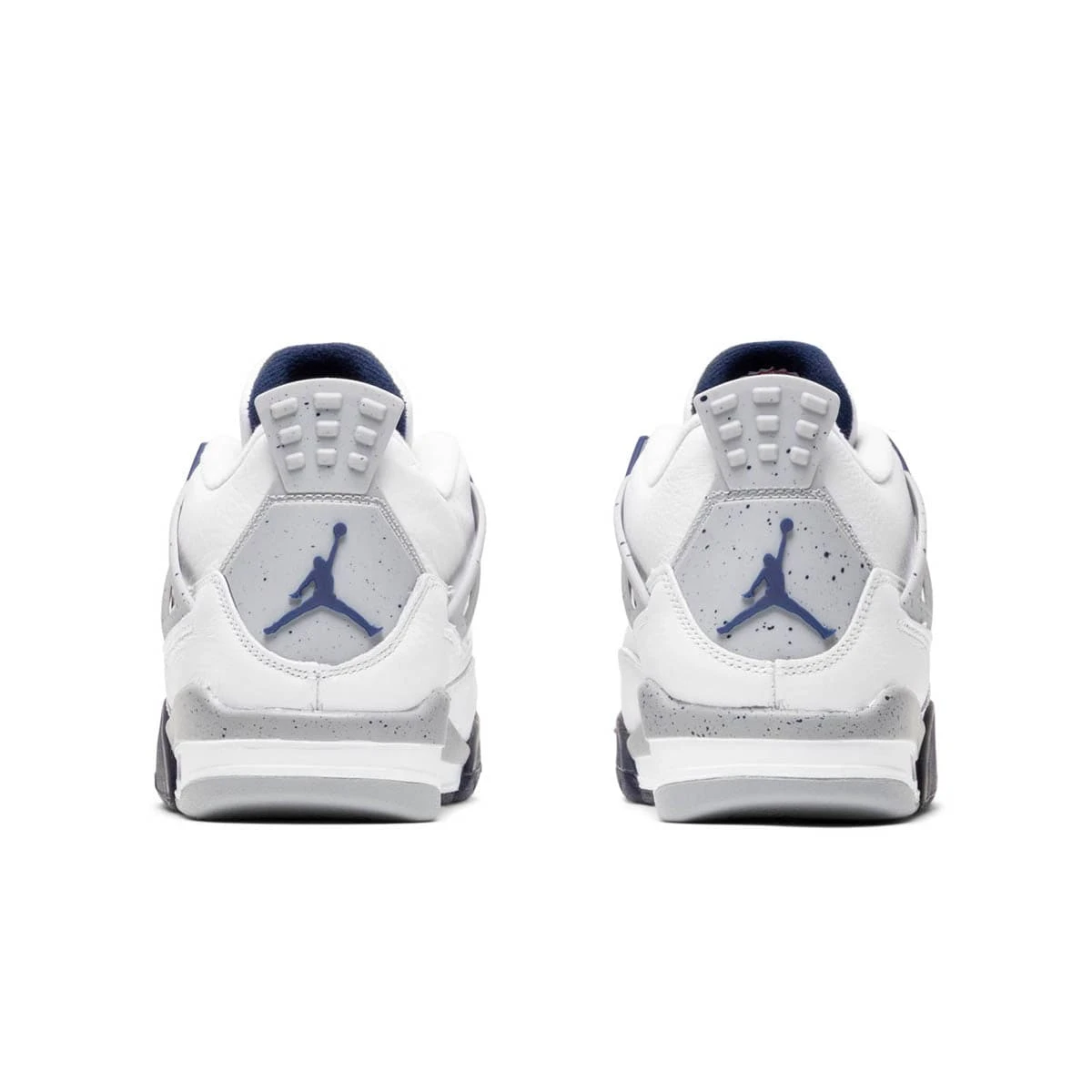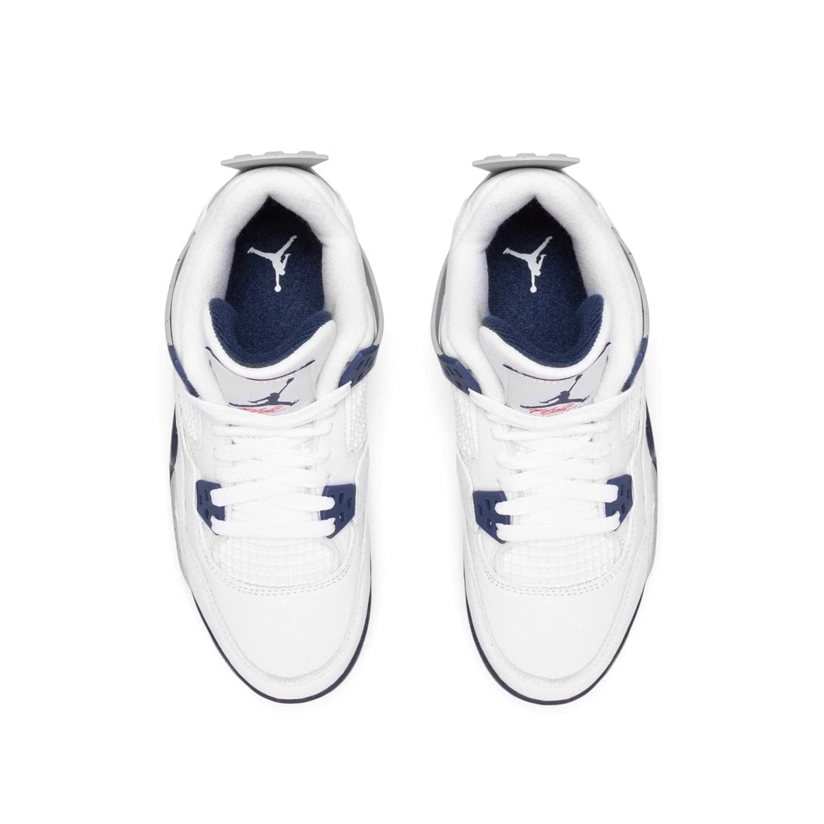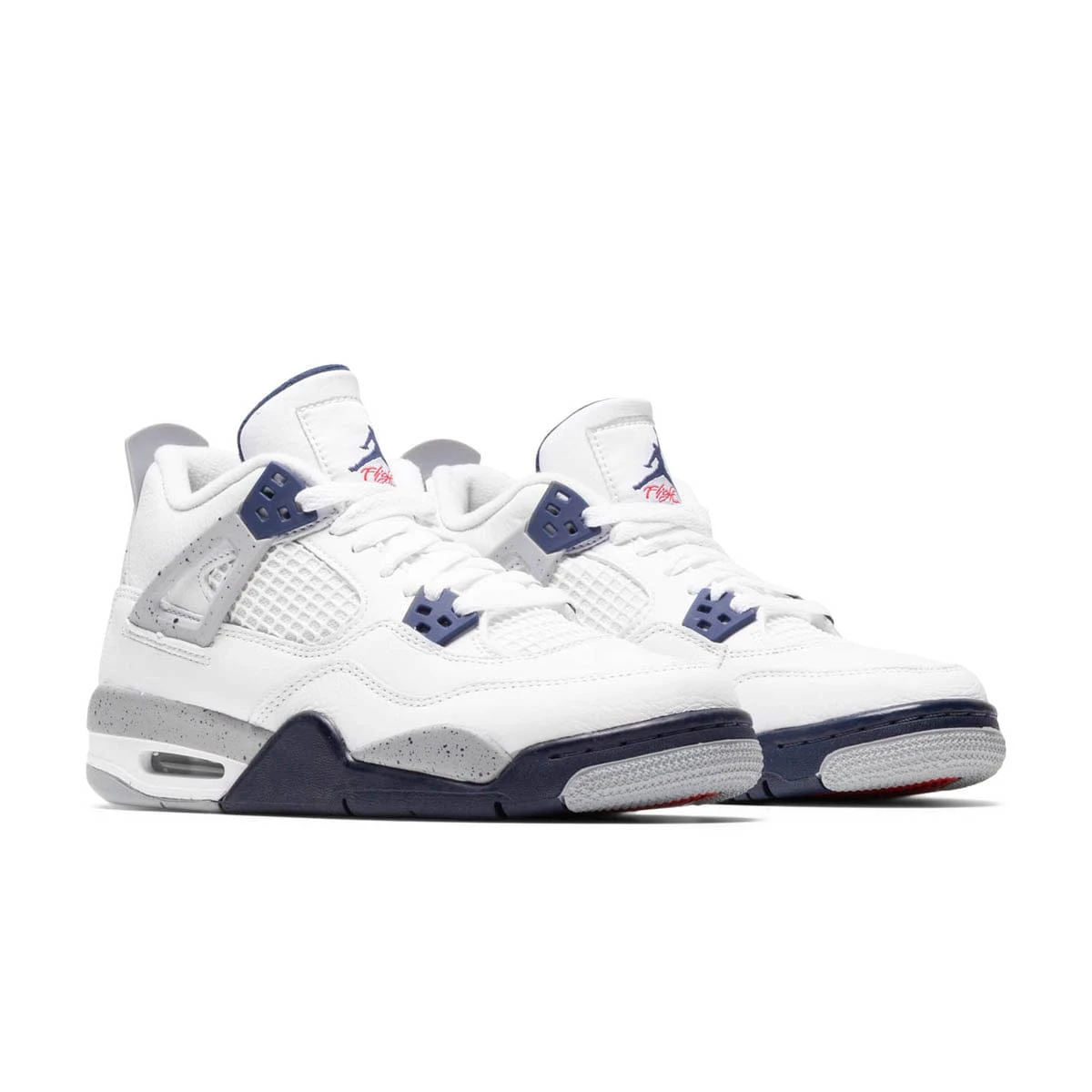 The Air Jordan 4 Retro ‘Midnight Navy’ dresses the legacy silhouette in the same color blocking used on the OG ‘White Cement’ colorway. The upper is constructed from white leather with black support wings, a matching black heel tab with embossed Jumpman branding, and navy molded eyelets. A second Jumpman icon adorns the woven tongue tag in crimson. The sneaker rides on a two-tone polyurethane midsole, featuring encapsulated Air in the forefoot and a visible unit in the heel.